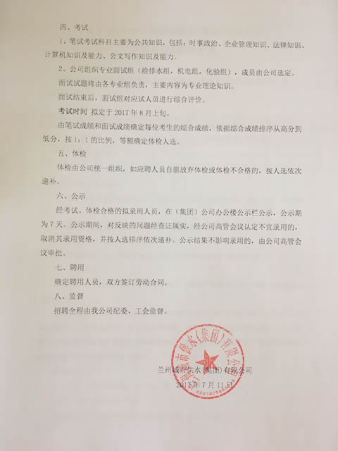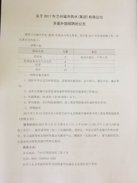 關(guān)于2017年蘭州城市供水(集團)有限公司開展外部招聘的公告