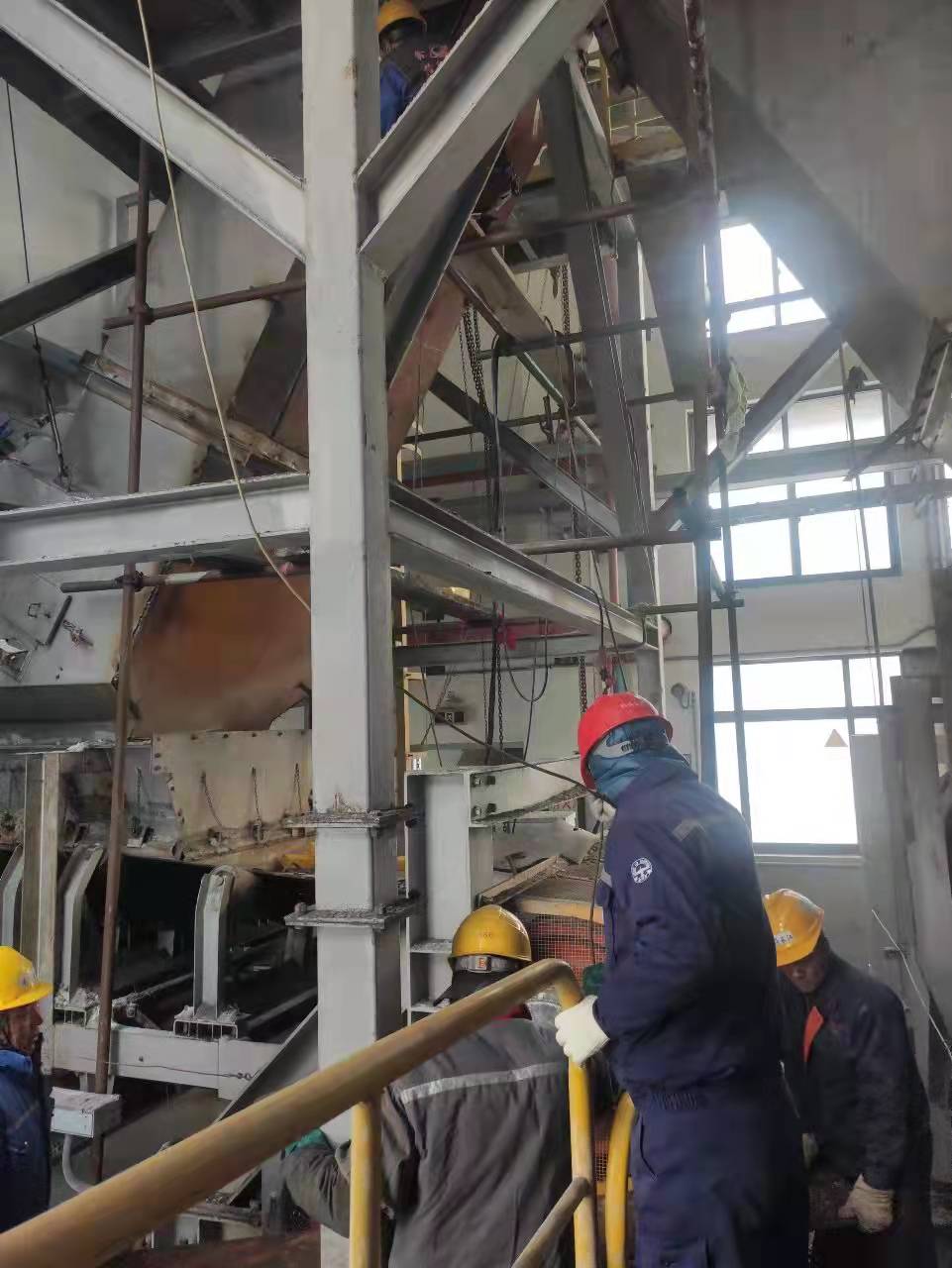 在石英砂作業(yè)過程中,由于料斗和溜筒壁磨損過大,會出現(xiàn)貨物撒漏的現(xiàn)象,需要及時對轉(zhuǎn)運站料斗和溜筒壁更換耐磨鋼板,同時,需要對改向滾筒進行包膠。包膠是一件耗時又費力的事,按照一般技術(shù)操作要求,必須要先把滾筒拆下,送到廠家進行包膠,然后再運回來進行安裝。從拆到安裝最快需要一周的時間。為順利完成生產(chǎn)工藝設(shè)備設(shè)施保養(yǎng)維護工作,公司技術(shù)管理人員放棄休息時間,成立攻關(guān)小組,通過查閱相關(guān)資料、反復(fù)研究探討,最終確定直接在作業(yè)現(xiàn)場進行包膠的方案。在生產(chǎn)廠家的協(xié)助指導(dǎo)下,僅僅用了兩天時間就完成了滾筒的包膠,為生產(chǎn)作業(yè)搶得了更多的時間。