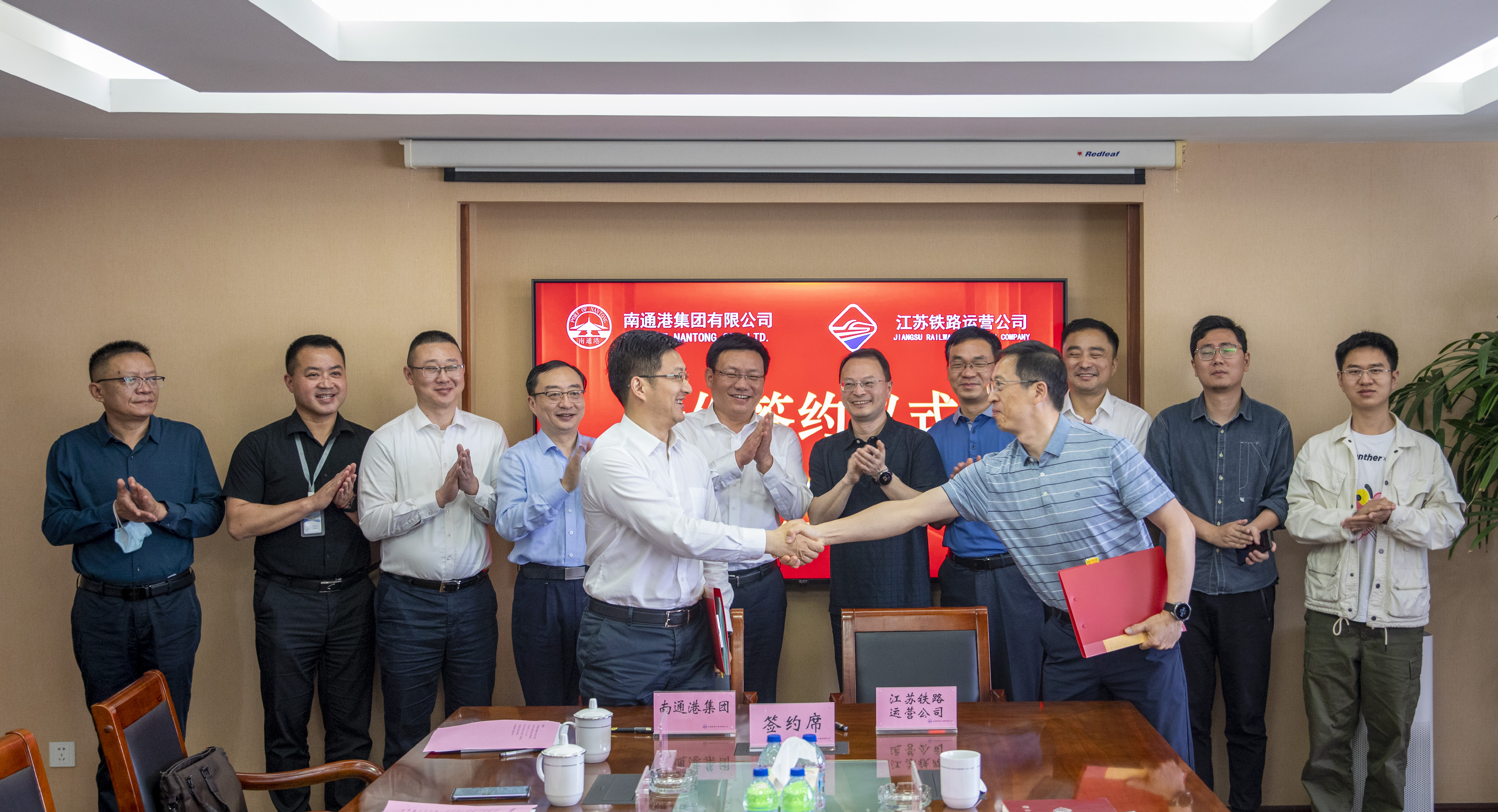 江蘇鐵路運(yùn)營公司運(yùn)營事業(yè)部部長(zhǎng)奚鵬,公司運(yùn)營事業(yè)部工程師周誠、張楠,南通港集團(tuán)通海鐵路公司黨支部書記、董事長(zhǎng)顧焱華,總經(jīng)理鎮(zhèn)杰,副總經(jīng)理張國光,南通港貨運(yùn)中心有限公司董事長(zhǎng)、總經(jīng)理范斌及集團(tuán)行政事務(wù)部副部長(zhǎng)(主持工作)周軍等共同見證本次簽約活動(dòng)?;顒?dòng)由顧焱華主持。